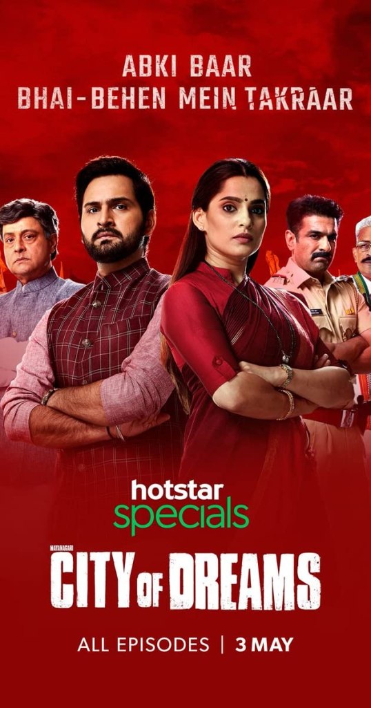 City of Dreams, Hindi web series streaming on Disney+Hotstar since May 2019. It is a political-family-crime drama, with 10 episodes of 38-55 minutes average length.